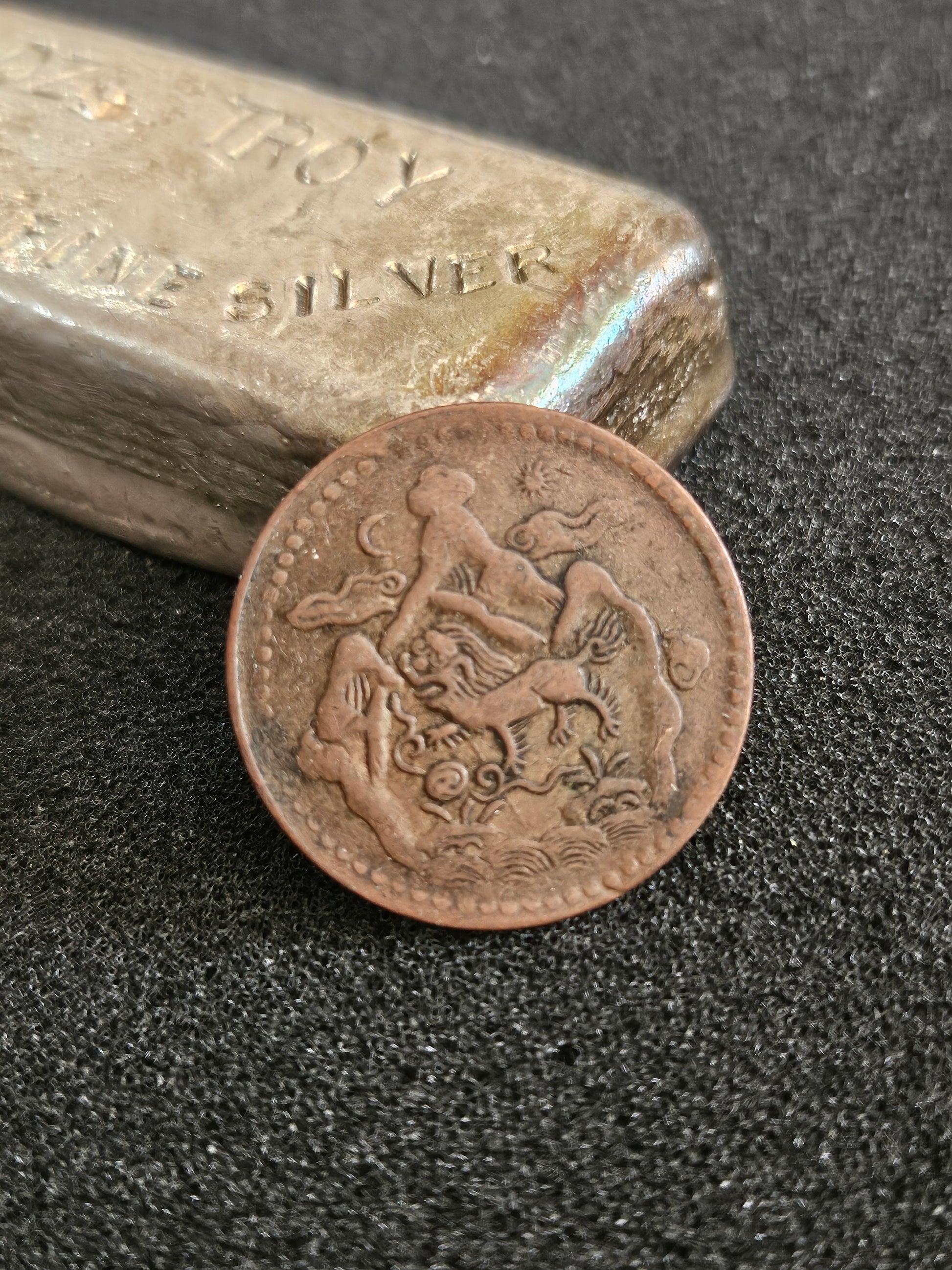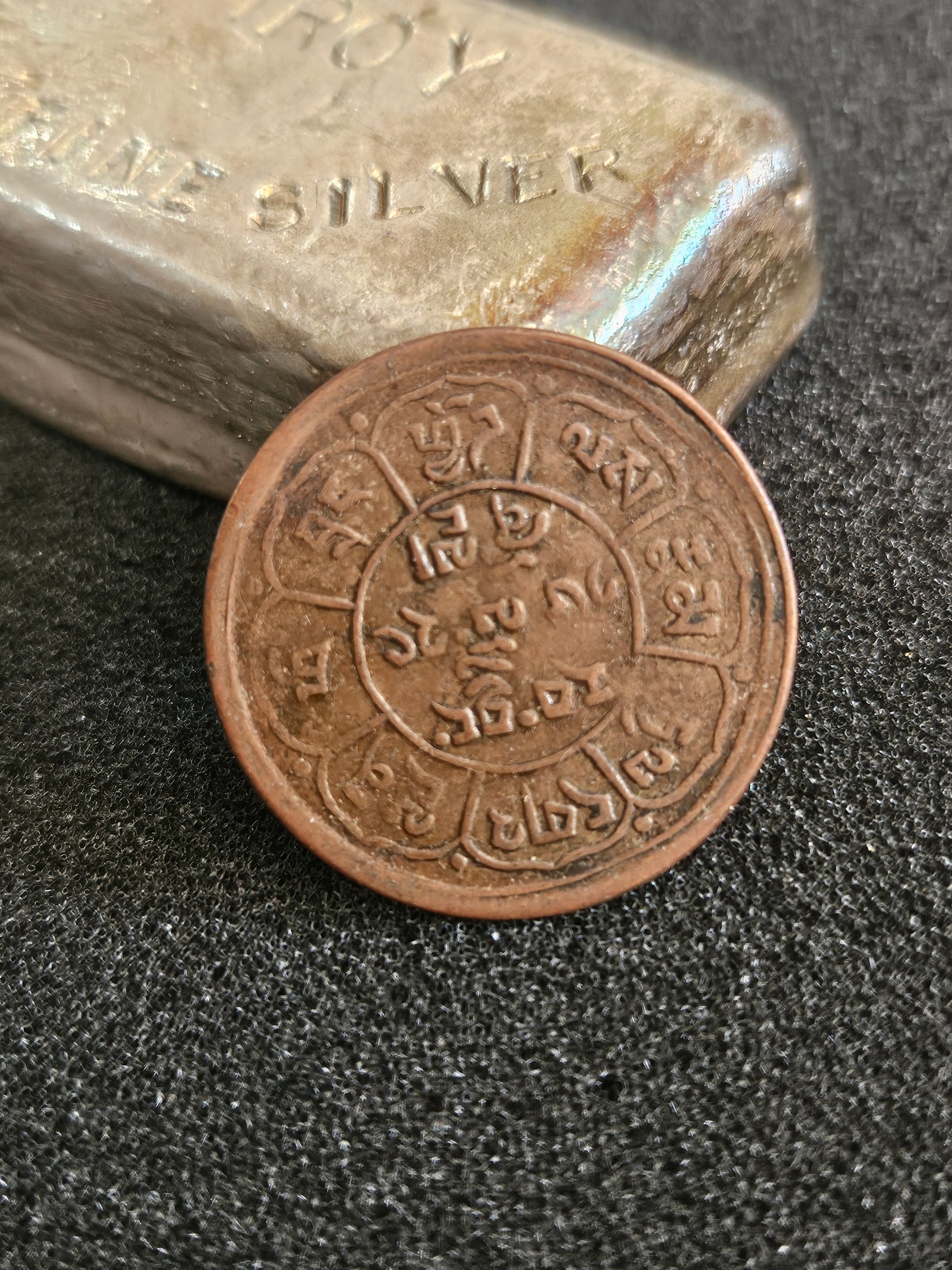 Average circulated , Observe : Snow lion facing left in front of Mt Kailash with moon and sun in the background .Tibetan characters surrounded by petals and lotus on the reverse . Composition :Copper .