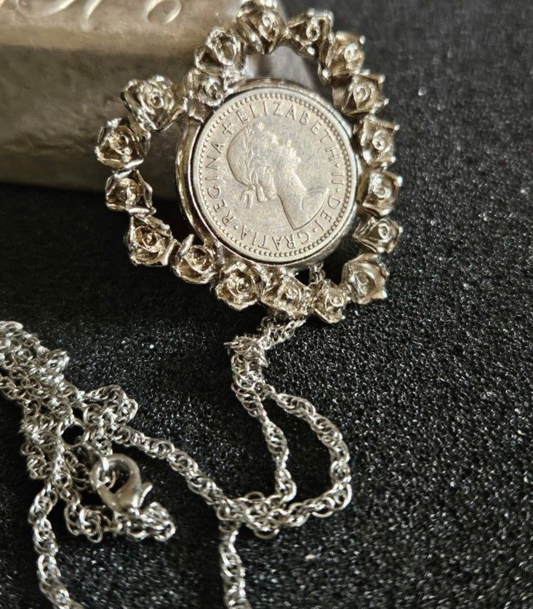 Vintage Rose pattern heart shape design , with a 1957 British 6 Pence coin pendant .